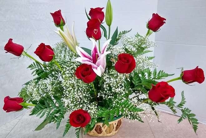 Basket with beautiful 12 red roses, to express yourself.