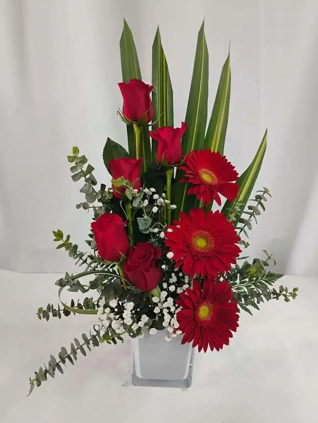 The combination of deep red roses and bold gerberas is a testament to artistry and elegance. The rich hues of the roses symbolize passion and love, while the bright gerberas add a cheerful layer of warmth and vitality. Arranged with precision and care, this piece is designed to make a striking statement, instantly elevating any space or occasion.