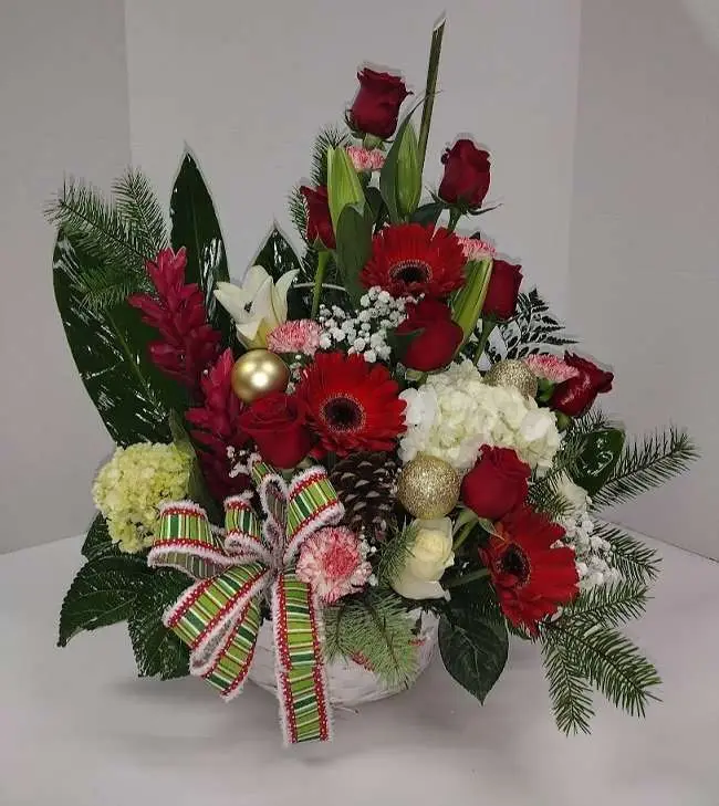 Beautiful Christmas flowers arrangement in a basket.