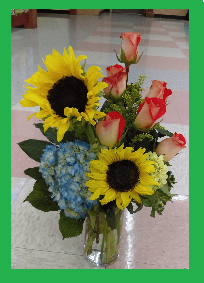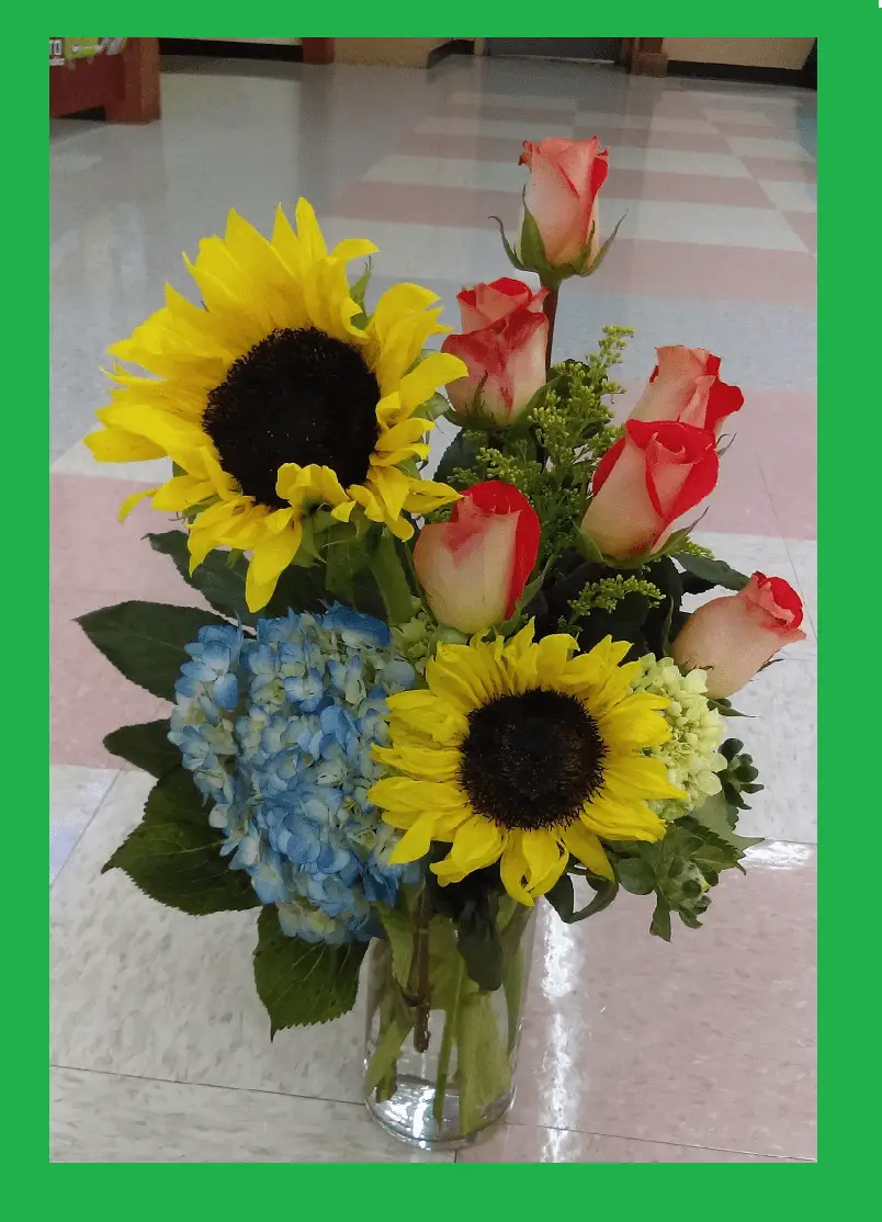 Beautiful flowers design is a great color arrangement with awesome roses, hydrangeas and sunflowers send flowers in Dallas with Estrella’s Flower Shop.