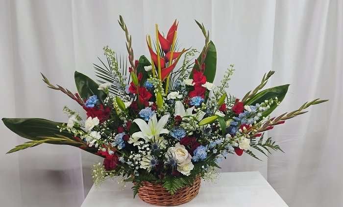 Red roses, gladiolus, carnations, delphinium & lilies.