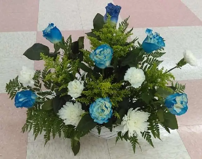 Blue roses,some spiders that you can choose the color,some daisies, statice, solidago flowers, green leather leave, and fillers.