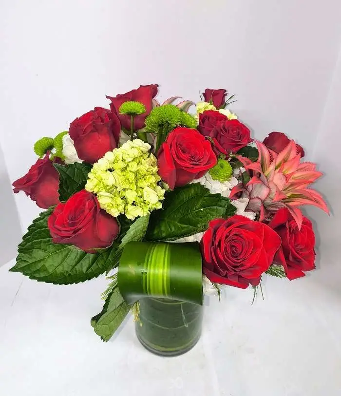 Red roses, Hydrangeas, and other beautiful fresh flowers to celebrate Christmas with love.