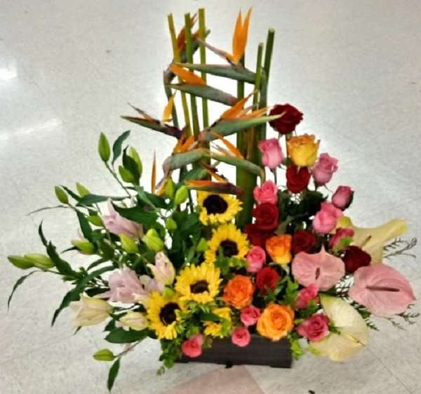 Beautiful and exotic, roses and tropical flowers, anthurium, bird of paradise, sunflowers, and elegant roses.