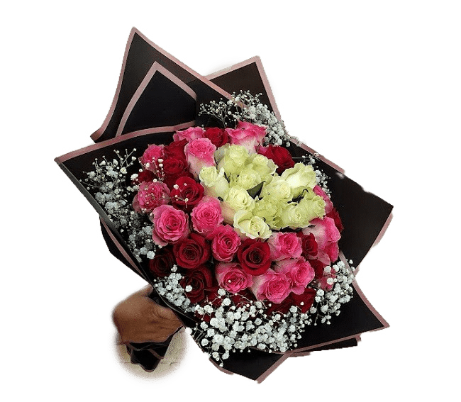 Fifty beautiful roses , Mix color roses, red, white and pink.