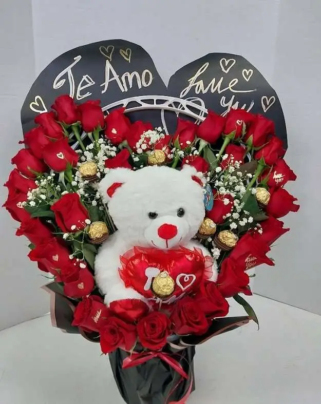 Roses in heart shape, chocolates, teddy bear, and a carboard with a text.