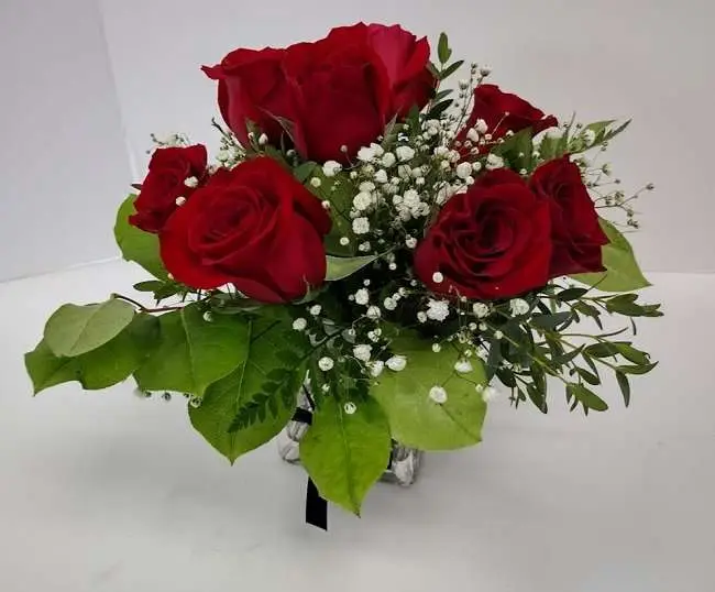 Glass cube with 8 roses.