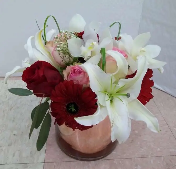 Roses, lilies, orchids, and gerberas. Beautiful flowers in a quality vase.