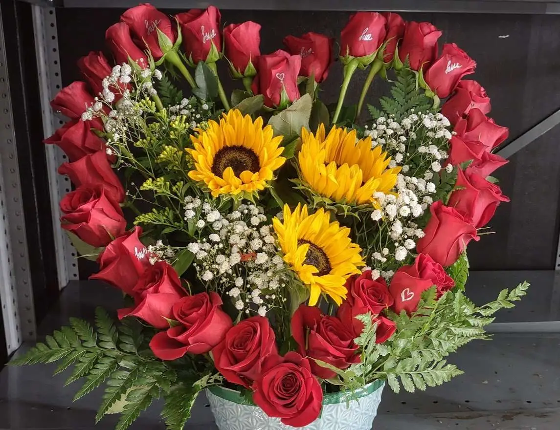 Beautiful roses in a heart shape with sunflowers in the center.( vase can be different)