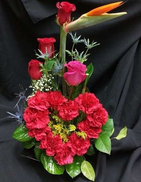 Beautiful heart of carnations, roses and a bird of paradaise.