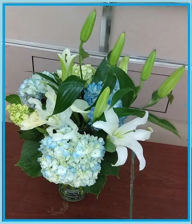 Hydrangeas and lilies in vase plus some green leather leaves, simple but elegant and beautiful flowers.