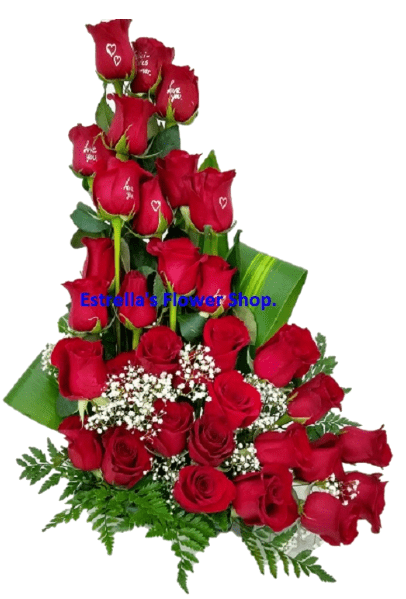 Just roses with some green leather leaves and some tropical leaves to make it look even better. Send fresh flowers and elegant designs with Estrella’s flowers shop.