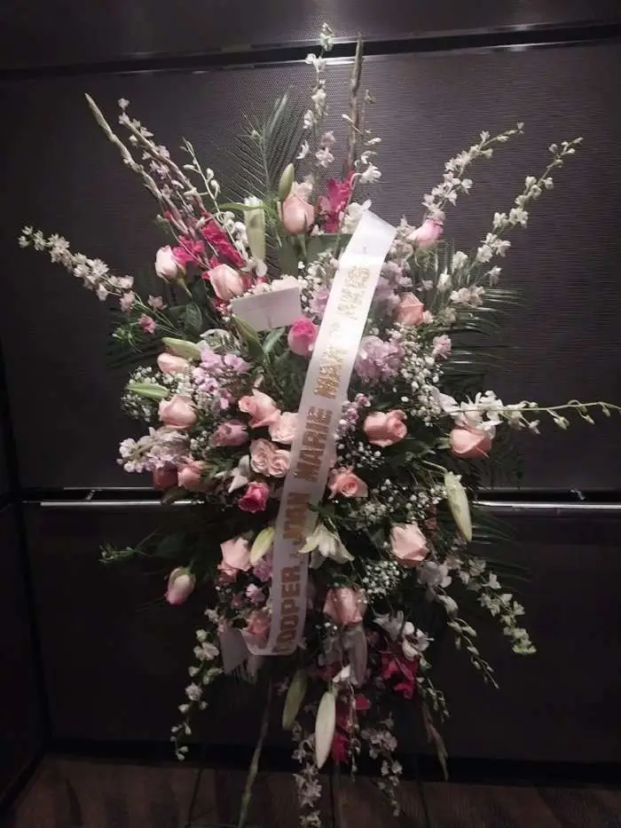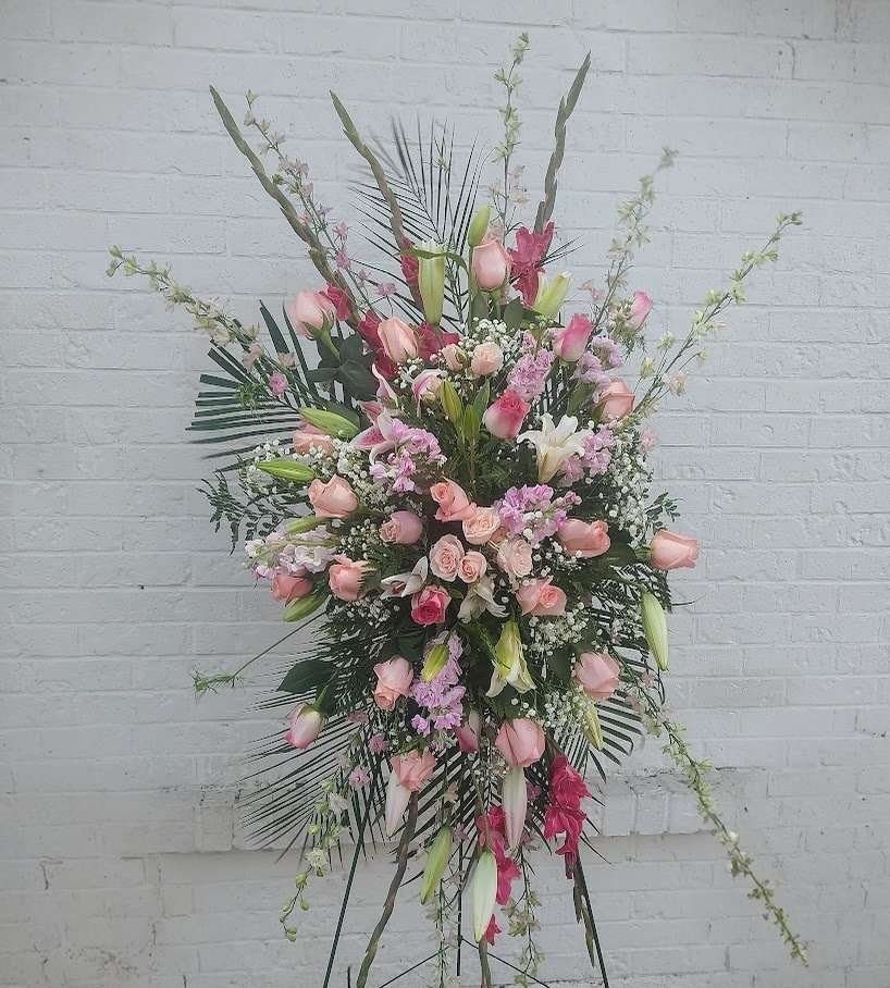 Light Blooms Spray at Estrella’s Flower Shop is a unique and elegant standing spray featuring light-colored blossoms, including roses, gladiolus, stock flowers, larkspur, lilies, orchids, baby’s breath, and green fillers. Perfect for funeral and symphaty, this graceful arrangement embodies sophistication and charm, making it an ideal choice for expressing your sentiments. As a local florist in Dallas, TX, Estrella’s Flower Shop offers same-day flower delivery within Dallas and surrounding cities, ensuring your thoughtful gesture arrives fresh and timely. Trust Estrella’s to bring beauty and elegance to your special moments with our expertly crafted floral arrangements.