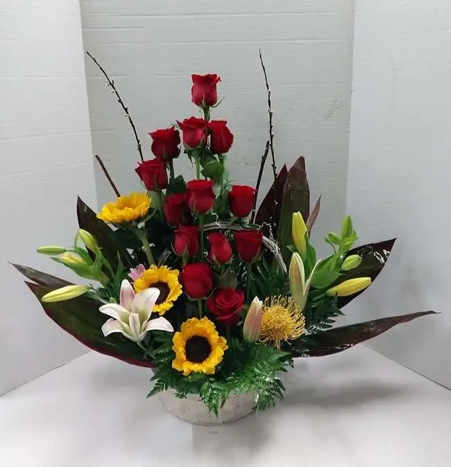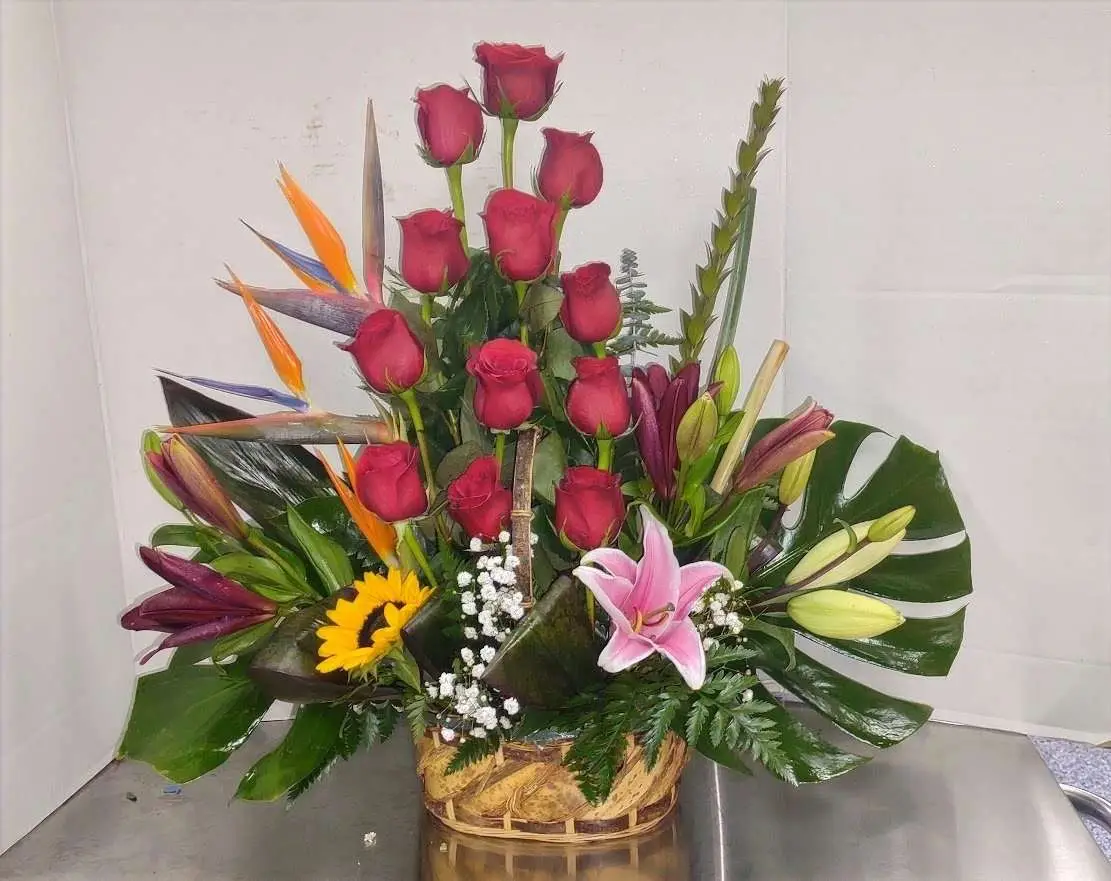 Roses, Callas, lilies, pink cushion, orchid, and more flowers in a beatiful basket design.