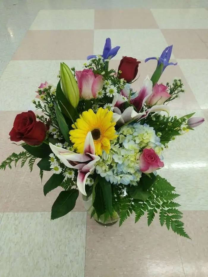 Beautiful expression of love flowers with hydrangeas, lilies, some tulips, gerberas daisies, iris, 7 roses and much more.