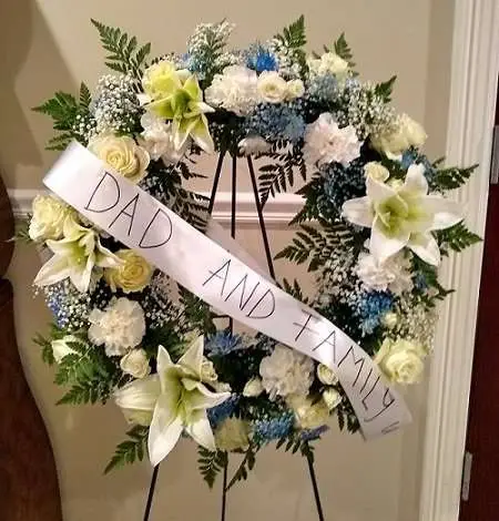 Crown of flowers on a standing easel. beautiful flowers, elegant designing with Estrella’s Flower Shop.