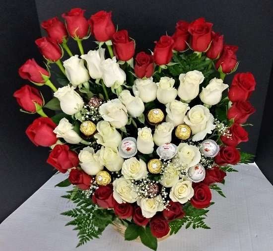 Big and beautiful heart of red roses, with chocolates and full with white roses.