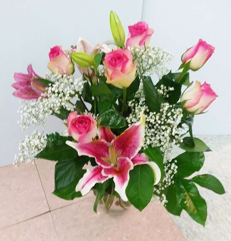 Six beautiful pink roses and some pink lilies, some baby’s breath and green leaves. simple and classic floral arrangement.
