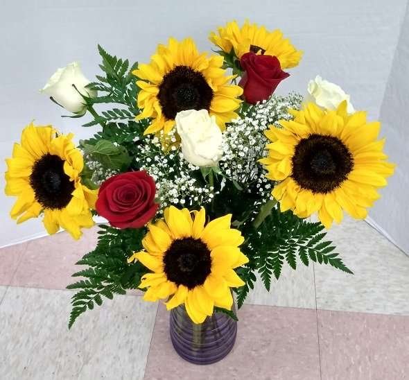 Five beautiful sunflowers, 2 red roses, and 3 white roses, beautifully arranged in a crystal vase with green leather leaves, and baby’s breath. Send flowers with Estrella’s Flower Shop in Dallas, TX.