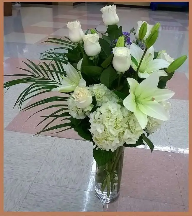 Elegant and precious flowers in vase, white roses,lilies, and hydrangeas are the main flowers in this beautiful flowers design send flowers today in Dallas.