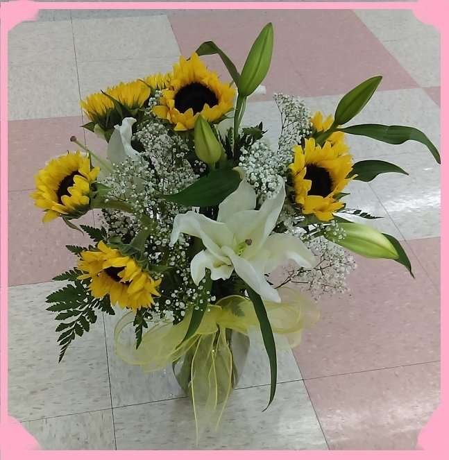 Seven beautiful sunflowers and lilies in vase.