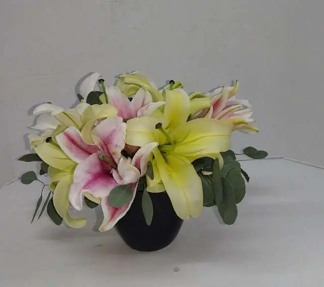 Short vase with lilies. simple vase with a few lilies, lilies smell just amazing.