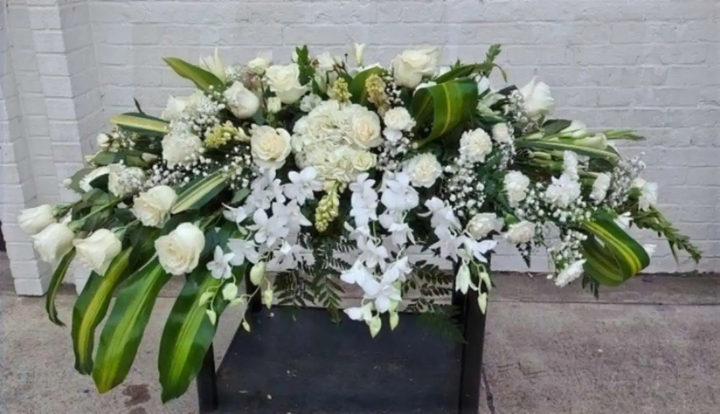 Beautiful and special casket cover with roses, lilies, calla lilies, tuberoses, gladiolus, orchids, carnations, hydrangeas, carnations and baby’s breath.