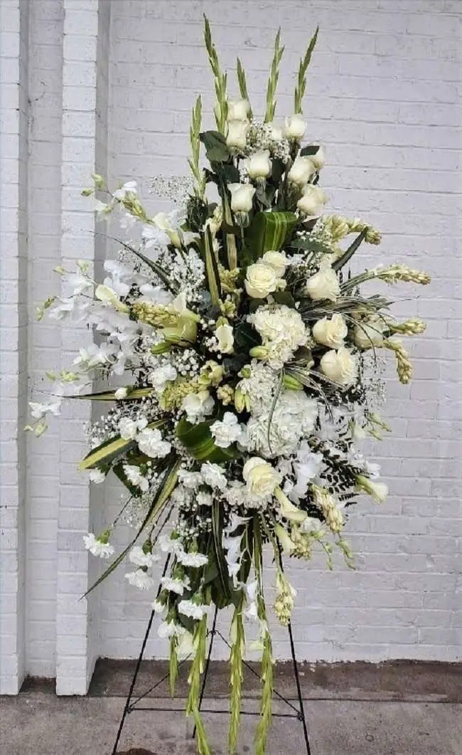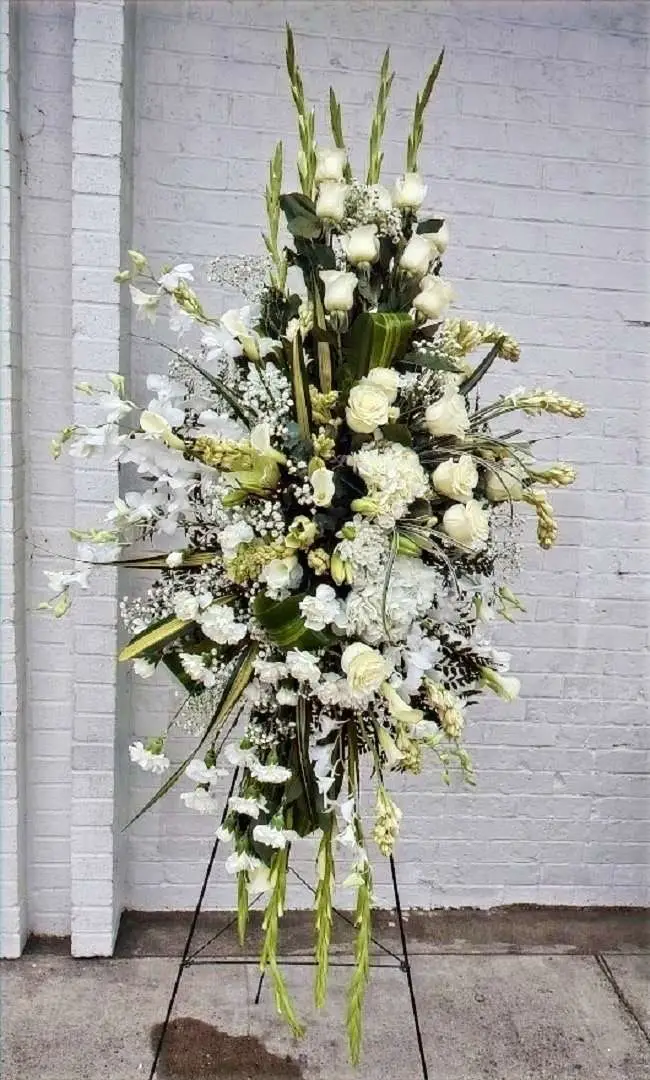 Special standing spray with roses, hydrangeas, calla lilies, orchids, carnations, gladiolus, tuberoses, tropical leaves, baby’s breath and lilies.