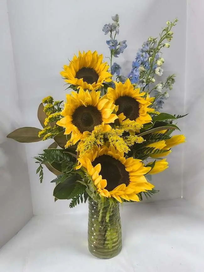 Summer sun is a floral arrangement with 4 sunflowers, 4 yellow tulips and 4 blue delphiniums.