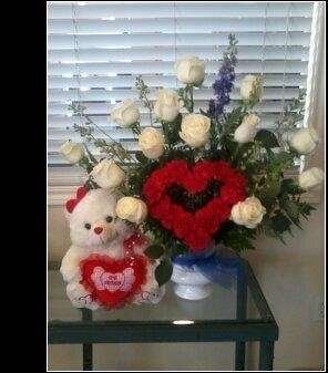 Roses around a red heart with carnations and next to a medium size teddy bear.