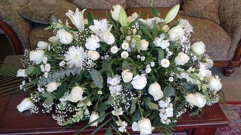Big flowers arrangemet for a casket is about 3 1/4 feet long and 2 feet wide size.