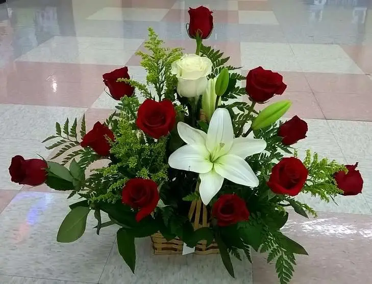 Beautiful roses basket arrangement, red roses, a lily, and one white roses.