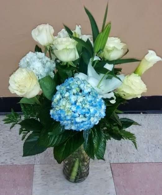 long stem roses,callas,lily, hydrangeas, green leaf and other fillers.