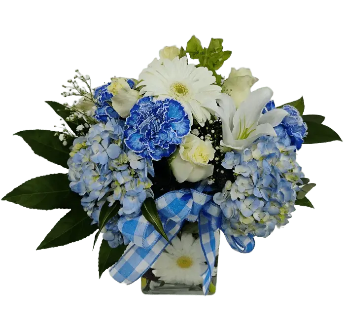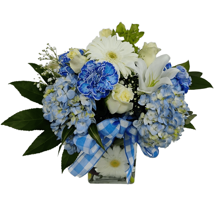 Welcome a baby boy with white and blue flowers in a beautiful arrangement.