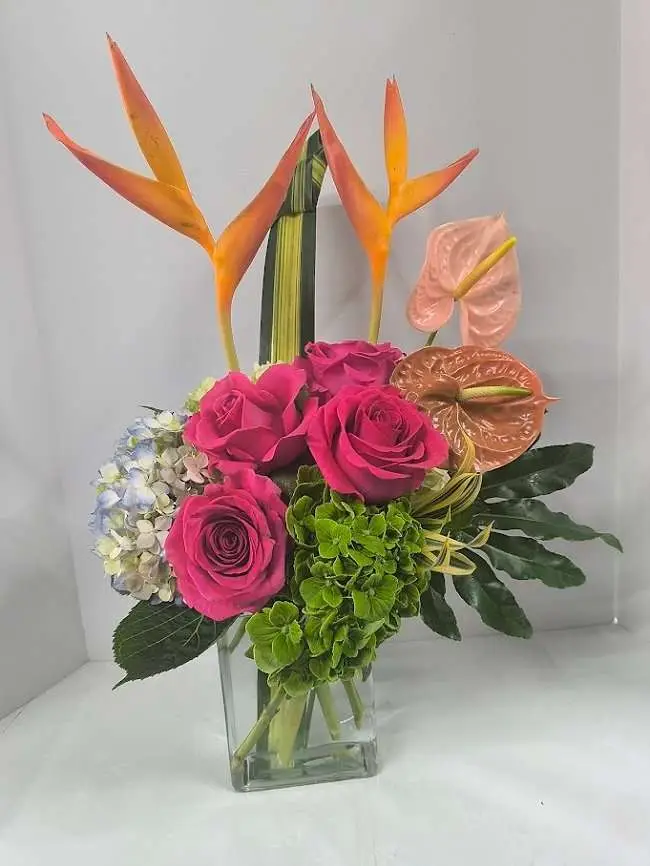 pink roses, hydrangeas, small heliconias, and anthuriums.