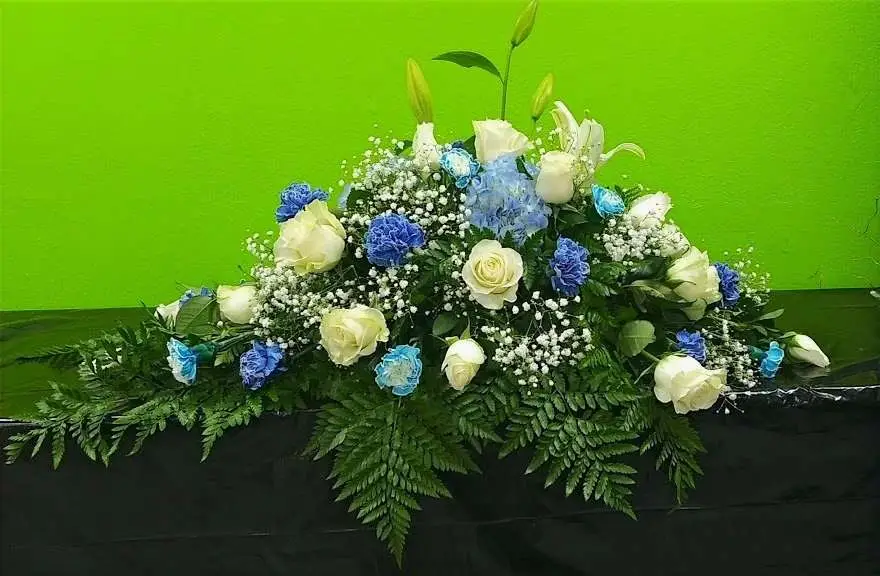 Beautiful flowers, white and blue casket cover with Estrella’s Flower Shop.