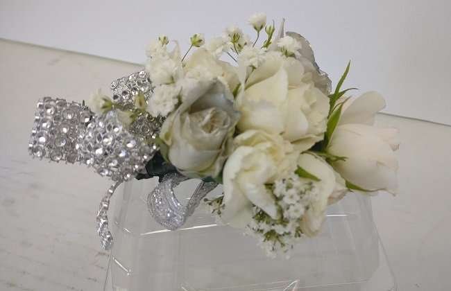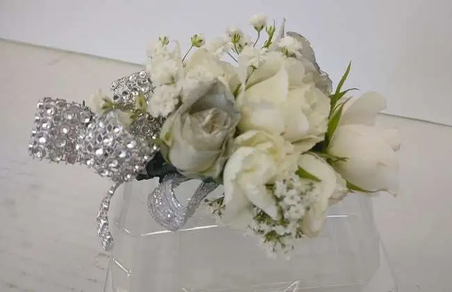 White roses, baby’s breath flowers, spray roses and silver ribbon bow. Send a beautiful white corsage to celebrate that special occasion.